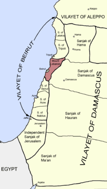 [3] Vilayet (wilayat): Subdivision administrative de premier ordre de l’empire ottoman Le vilayet de Beyrouth est détaché en 1888 du vilayet de Syrie. Il couvre toute la région côtière de Lattaquié à Akka (en Syrie) sauf le moutassarifat du Mont-Liban qui constitue un territoire autonome. (https://fr.wikipedia.org/wiki/Vilayet_de_Beyrouth)