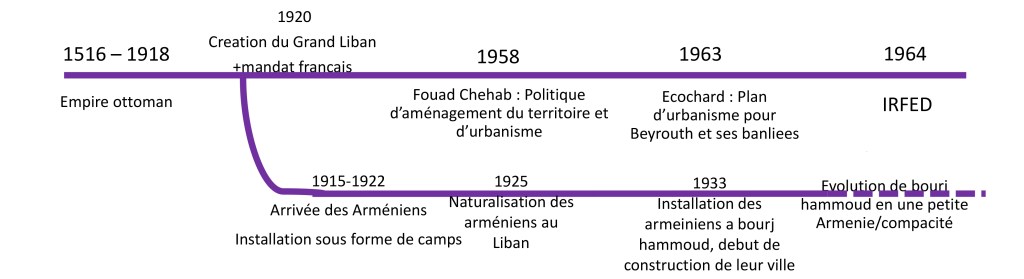 Alors que Beyrouth se développait et se modernisait sur le plan urbain, une partie de sa banlieue agricole fut habitée par la communauté arménienne : En tant que réfugiés, les arméniens s’installèrent sur ce terrain agricole, situé sur la frontière entre l’ancien vilayet de Beyrouth et la moutassarifat du Mont Liban. C’est sur cette terre que la communauté arménienne commença par construire elle-même sa ville, « la petite Arménie » connue aujourd’hui sous le nom de Bourj Hammoud. A peine furent-ils installés dans la banlieue de Beyrouth à Bourj Hammoud, que les arméniens établirent le commerce. Ils commencèrent donc par répartir leurs rues en un plan damier, en donnant à chaque rue sa fonction commerciale (exemple Arax, pour épices, Yerevan pour bijoux..).
