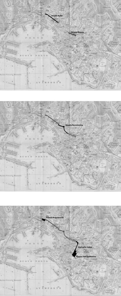 En 1815, sous le règne de La Sardaigne, un Corpo Decurionale composé de 40 nobles et 40 bourgeois, avec un maire pour chaque partie, a autorité pour dessiner des projets urbains. Cependant ils doivent être validés par le pouvoir central, puis exécuté par un Commissaire d’Etat. Ainsi des projets de percées naissent mais avec difficultés. L’architecte Barabino est ainsi à l’origine de la place San Domenico qui poursuit le parcours initié par la Strada Nuova et Nuovissima en ajoutant la Via Carlo Felice. Il planifie surtout le mouvement d’expansion au Nord vers les collines. Les frontières naturelles sont abattues par le progrès technique.