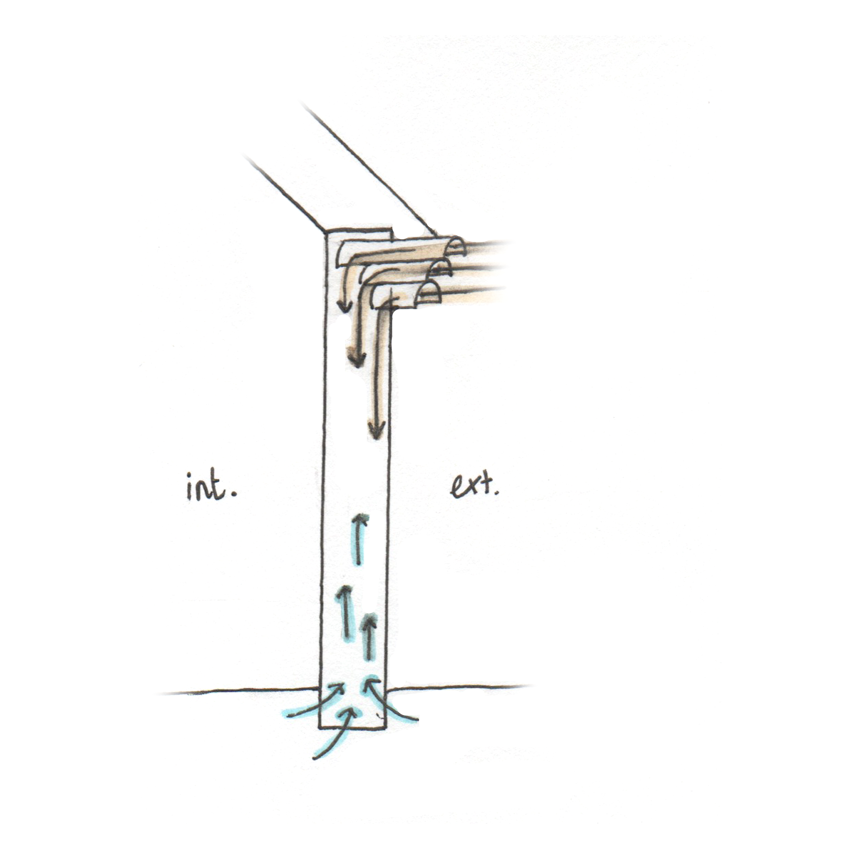 Cet appareillage de tuiles permet au vent de s’infiltrer, à travers la chaux poreuse, au cœur de la maçonnerie. Environ 120 jours par an, le vent souffle sur le bâtiment et vient assécher l’intérieur du mur. Autour des tuiles plantées dans le mur se crée une zone dans la chaux qui ne contient plus d’humidité. Petit à petit, à mesure que le mistral souffle, le mur s’assèche.
