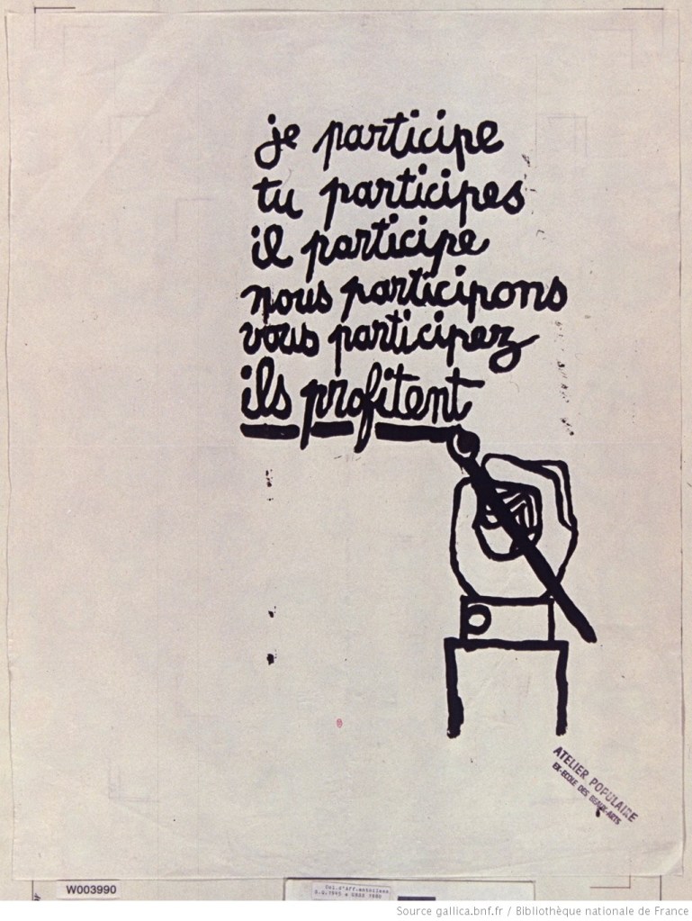 Pour l’exemple français, elle prend racine dans la critique du modèle des grandes opérations d’aménagements après-guerre : ces revendications et contestations du pouvoir centralisé s’inspirent de l’ouvrage Le droit à la ville du philosophe français Henri Lefevbre. Il accuse cet « urbanisme des administrateurs liés au secteur public (étatique) »(1)négligeant l’humain en réduisant la ville à un réseau de circulation, de communication, de décision et d’information. En ce sens, il préconise une méthode d’urbanisme qui pourrait devenir une « pratique sociale concernant et intéressant l’ensemble de la société. » (2)