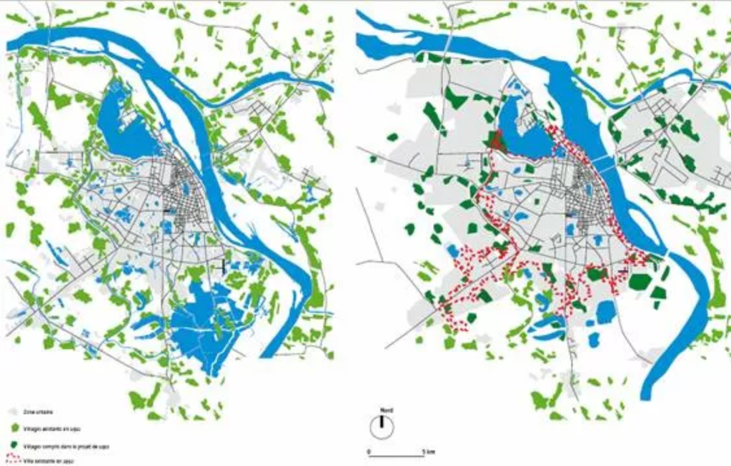 L’un des premiers plans de Hanoi dressé par le gouvernement vietnamien indépendant, renoue avec les représentations anciennes où la zone urbaine n’est pas dissociée de son territoire. Ce plan préfigure la planification ultérieure que connaitra la capitale sur un plus large territoire. A partir des années 80, des réformes du Doi moi, le boom économique des années 90 et l’explosion démographique qui l’a accompagné, de vastes ensembles multifonctionnels appelés « nouvelles zones urbaines » (ou khu do thi moi, ou KDTM) sont apparus sur les franges de la métropole. Le schéma directeur de 2010 serait-il à la recherche d’une forme de persistance de la structure spatiale du phuong dans le Hanoi contemporain ?