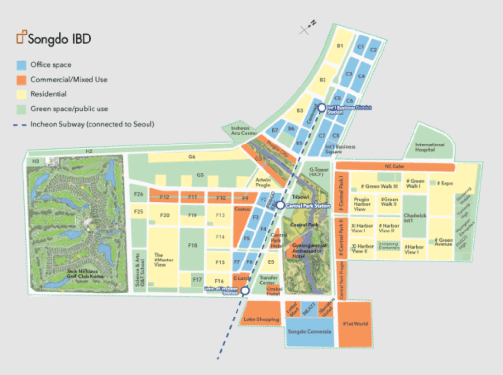 40 milliards de dollars ont été investi, majoritairement par des acteurs privés sud-coréens et américains pour la réalisation ce projet. L’initiative est lancée en 2003 par la ville d’Incheon. 607 hectares ont été construits sur la mer Jaune et directement reliés à l’aéroport international d’Incheon- le plus grand du pays. Il s’agit initialement de créer un hub économique international (International Business District) sur la zone d’économique franche d’Incheon. Ce projet d’envergure prévoit notamment 2 800 000 m2 de constructions résidentielles, 4 200 000 m2 de bureaux et 1 400 000 m2 d’espaces commerciaux et hôtelier.