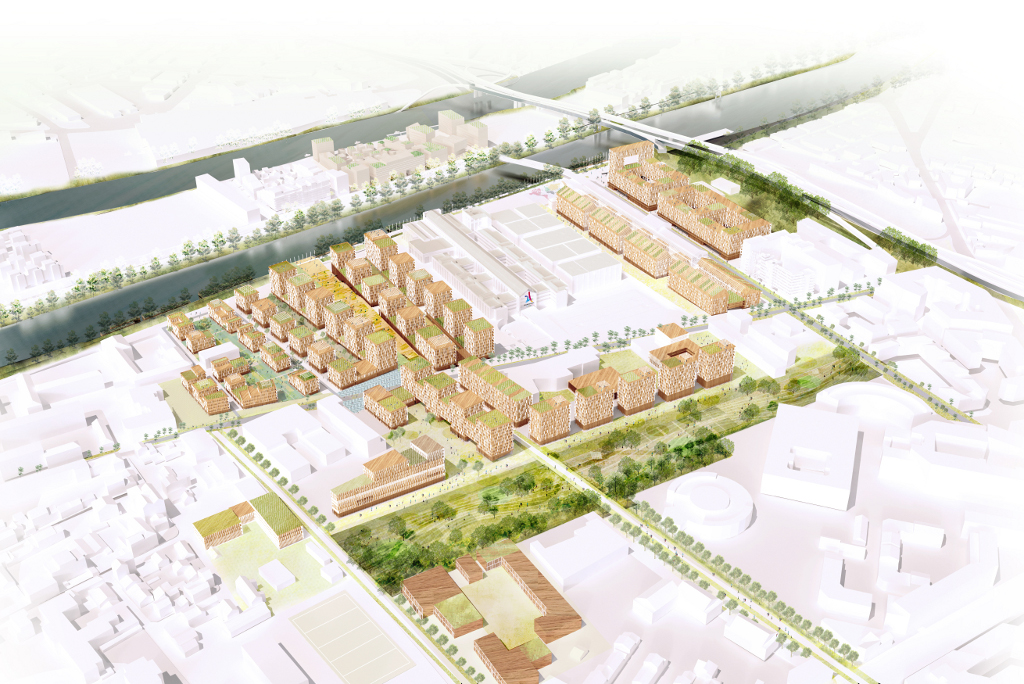 - Les eaux pluviales et leur récupération est géré à l’échelle du quartier à travers une série de bassins et de différents systèmes paysagers favorisant la biodiversité imaginés par Gustafson Porter, le paysagiste qui travaille avec Dominique Perrault sur le projet. Ainsi, le projet vise «100% des besoins en eau» pour l’arrosage et le nettoyage des espaces publics, couverts par la récupération des eaux de pluie.