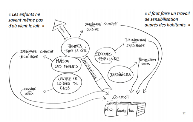 La co-construction avec les habitants est au centre de cette boucle car c’est in fine eux qui vont faire fonctionner l’appareil productif agricole et consommer. Dans un contexte de réduction des financements, les citoyens s’emparent de plus en plus des différentes problématiques publiques et innovent pour trouver des solutions alternatives, de nouveaux modes de consommer, qui répondent autrement aux enjeux humains et sociaux. Ainsi plus de 100 habitants de la zone des Tartres ont été mis à contribution avec 50 conversations dirigées, 11 entretiens approfondis, 5 ateliers participatifs (Femmes dans la cité, Secours populaire, Maison des parents, Centre de loisirs, Jardins familiaux) et une observation sur le marché. [2]