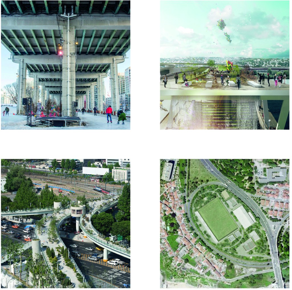 Longtemps synonymes de progrès, les autoroutes urbaines sont désormais source de congestions et de nuisances pour les territoires qu’elles traversent. La reconquête des infrastructures dédiées à la voiture est aujourd’hui de plus en plus acquise dans les politiques d’aménagement des villes. Malgré le caractère controversé de ces politiques, de nombreuses villes en Amérique du Nord, en Asie et maintenant en Europe se sont engagées dans leur transformation : reconquête des berges, abaissement des vitesses, partage de la voirie, cheminements doux…[8] Ces politiques urbaines attestent de la possibilité de requalifier durablement ces espaces fonctionnalistes. Malgré leur complexité, ces aménagements sont de véritables projets urbains, croisant des compétences d’urbanistes, d’architectes et d’ingénieurs. Ces métamorphoses présentent un caractère fort pour les villes qu’elles traversent. La visibilité de l’autoroute dans la ville lui confère une force de parcours pour ses habitants et en devient une véritable identité.
