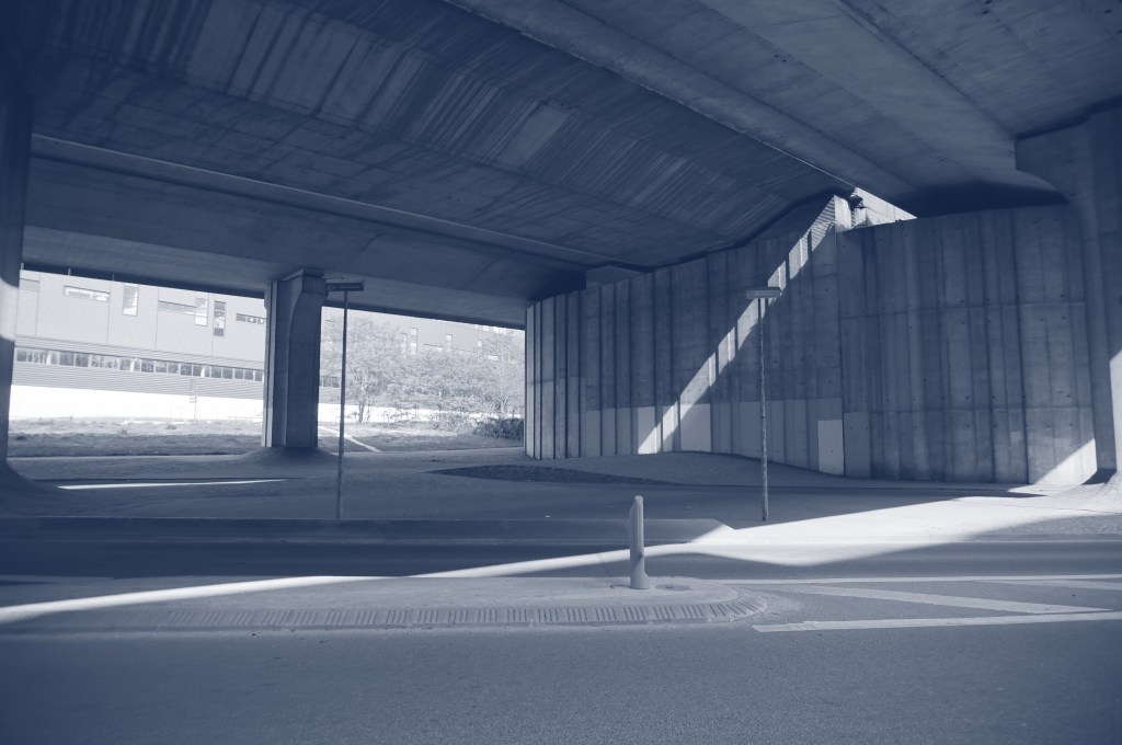 Si la lisière ville-autoroute se dresse comme un mur, la barrière liée à ces infrastructures reste ponctuellement perméable à la ville. Mais les interfaces entre l’infrastructure routière et les territoires traversés révèlent un grand nombre de dysfonctionnements. On constate que ces zones de franchissement sont majoritairement conçues pour être traversées par des véhicules motorisés, laissant aux piétons et aux cyclistes un franchissement éprouvant : nuisance sonore et visuelle, pollution, manque de place. Sous ce « grand trait de béton »[7]tracé par des ingénieurs en génie civil, un verso d’ombres et de pentes se crée.