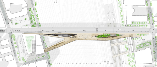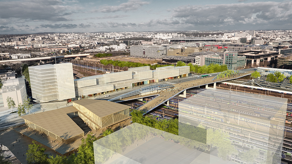 Le futur ouvrage de franchissement des voies ferrées de Saint Denis Pleyel (FUP), conçu par Marc Mimram et Thomas Richez, consistait, lorsqu’il a été déclaré lauréat, en une structure en acier, de 273 mètres de long, pour 62 mètres de large, constituée d’un pont routier intégrant voitures, transports en commun, vélos et piétons. Accolée à ce pont, une passerelle piétonne au plancher en bois offre un débouché direct reliant les gares Saint-Denis Pleyel et Saint-Denis Stade de France de part et d’autre des voies ferrées. Cependant cette passerelle se veut être plus que le généreux espace de traversée et de balade souhaitée par Plaine Commune. Cette adjonction a pour ambition, d’être aussi une nouvelle centralité, équipée de deux longues verrières, vouées à abriter un café et une serre plantée. Mais est-ce que le FUP, avec une fonction de franchissement certes cruciale peut se valoir de constituer un véritable lieu de vie sur un belvédère de 300 mètres de long au moyen d’un café et d’une serre ? Probablement pas.