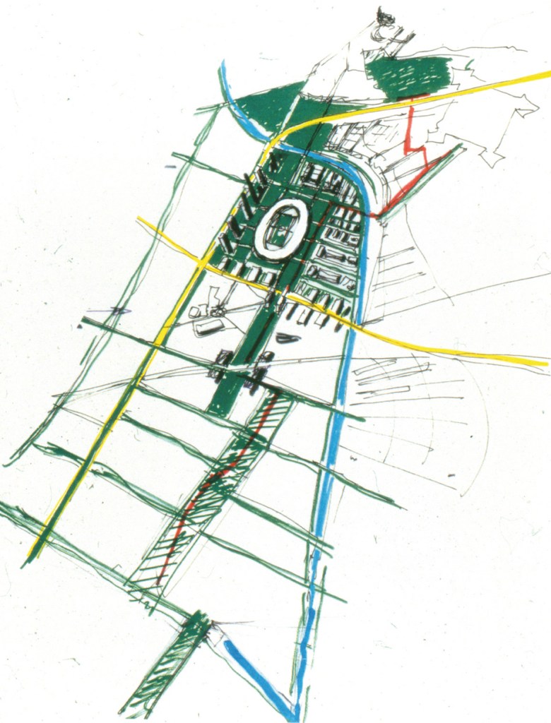 Le plan d’urbanisme, document guide, énonce les orientations formelles consistant à retracer un réseau dense viaire et d’espace public, une trame végétale ainsi qu’à reconstituer le système d’îlots pour développer de la mixité fonctionnelle. Le traitement de l’espace public quasi ex-nihilo représente dès l’origine le fondement majeur du projet urbain, puisqu’il est considéré comme le maillon manquant entre les fonctions jusqu’alors décousues que sont les entreprises et les logements.
