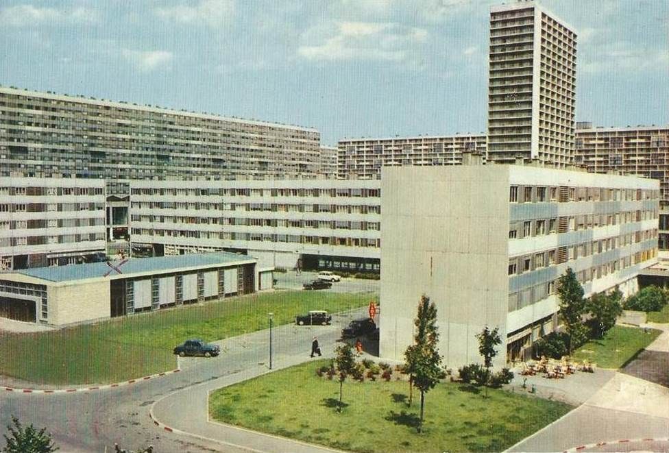 La « Cité des Quatre Mille logements » a été construite par l’OPH de la Ville de Paris entre 1956 et 1964 afin de désengorger la capitale, accueillir les immigrants d’Afrique du Nord et loger les ouvriers travaillant dans l’industrie locale. En 1967, Jean-Luc Godard, dans son film « 2 ou 3 choses que je sais d’elle », critique la conception du projet immobilier, parlant de « gestapo des structures »[7]. L’ensemble est cédé par la Ville de Paris à l’OPH de La Courneuve en 1984. La Cité des 4000 a immédiatement fait l’objet de politiques sociales de lutte contre la relégation spatiale et l’exclusion sociale. Ces quartiers ont présenté dès le début des années 1970 de nombreux dysfonctionnements sociaux, urbains, techniques et de gestion (mono fonctionnalité, enclavement, dégradation du bâti, équipements peu valorisés, îlots surdimensionnés, absence de qualification des espaces extérieurs)[8].