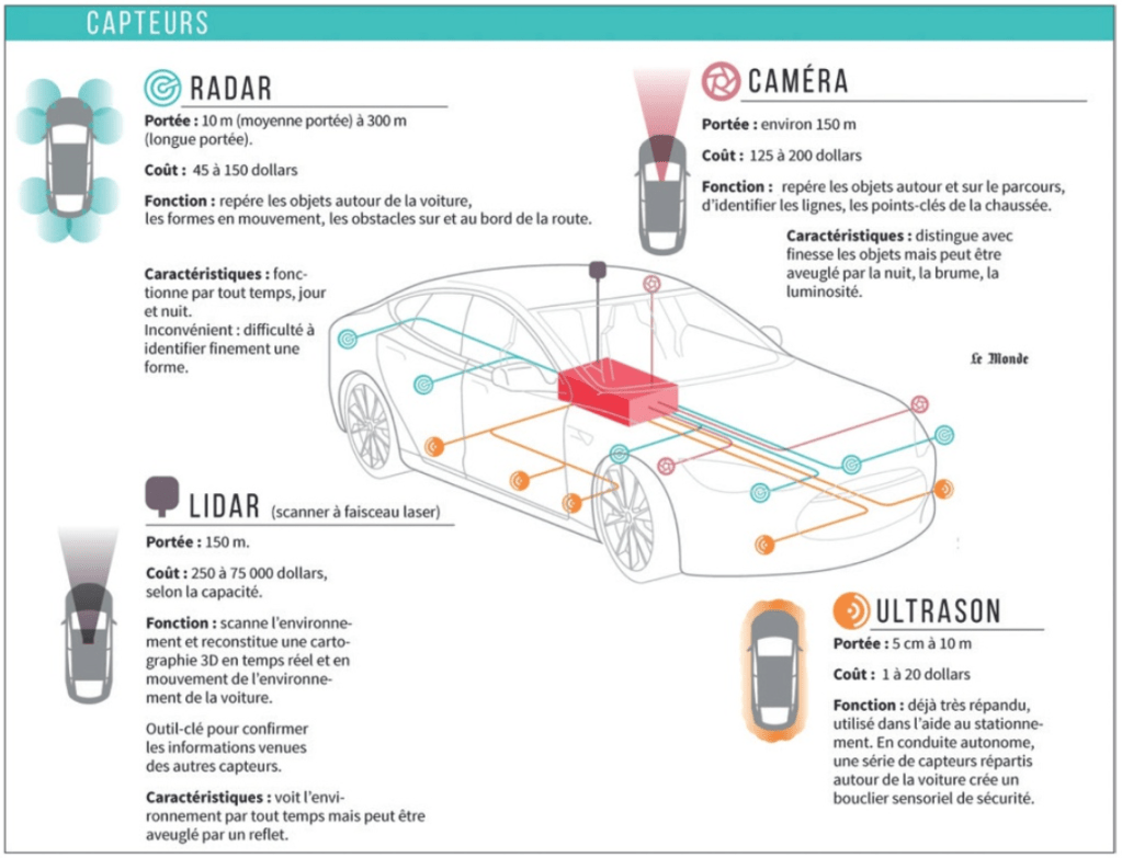 En effet, afin d’évoluer en toute autonomie dans leur environnement et d’assurer la sécurité de leurs passagers, ces véhicules embarquent des systèmes de pointe tels que des caméras à haute définition, mais aussi de nouveaux capteurs de détections performants : radars, LiDARs, capteurs ultrasons. Cette dernière technologie permet de compléter la vision des caméras qui permettent principalement de voir la signalisation routière horizontale. Ainsi les radars ou LIDAR, permettent d’estimer des distances et des vitesses avec une très grande précision. Le but est de produire des véhicules ayant des capacités proches, voire supérieures à celles des humains, comme le dit Daryn Nakhuda : « We want cars to have human judgment ».