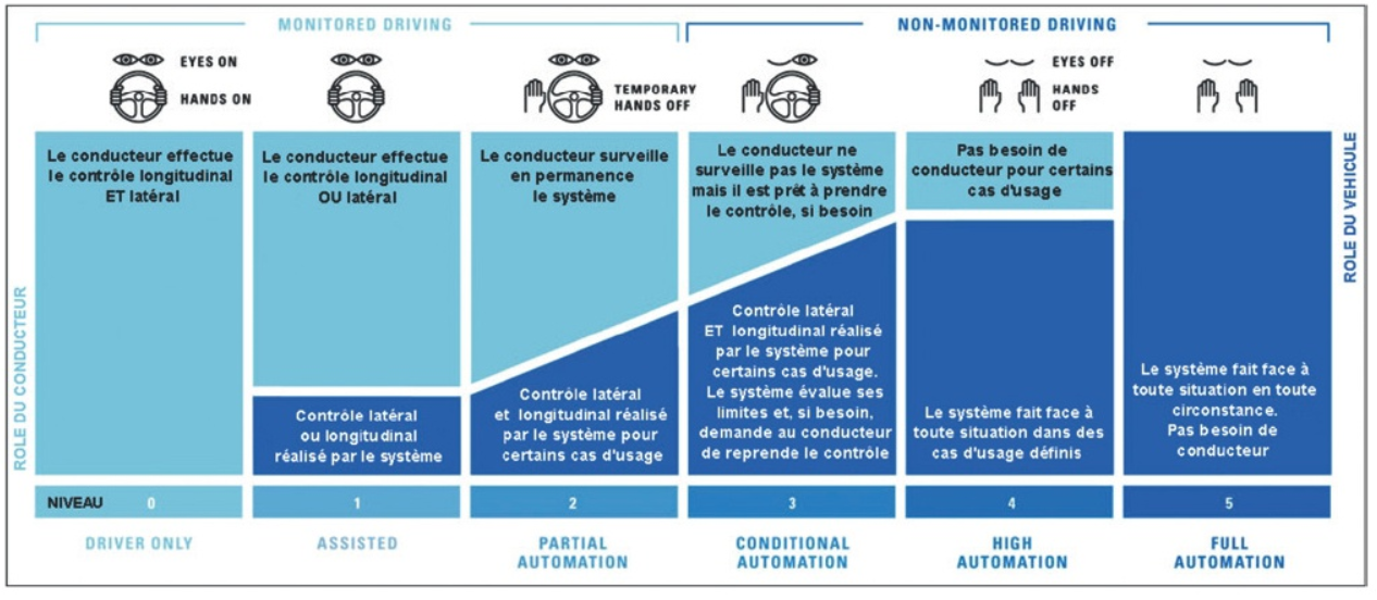 En 1964, Isaac Asimov décrivait un futur où les véhicules n’auraient plus besoin de conducteur pour déplacer ces passagers. Cette utopie tend à devenir une réalité avec les prouesses technologiques qui voient le jour ces dernières années. Mais de quoi parle-t-on lorsque l’on le parle de mobilité autonome ? L’automatisation des véhicules peut se décliner selon 5 grands axes : assistance à la conduite, automatisation partielle, automatisation conditionnelle, automatisation élevée, automatisation complète. Aujourd’hui, cette nouvelle technologie a été rendu possible notamment avec l’essor des technologies de perception et d’interprétation des informations.